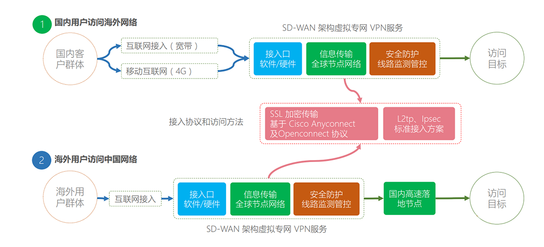 面向身处大陆的海外客户群体,提供基于大陆宽带、4G网络接入的网络连接方案,满足海外用户在大陆地区访问line、 Twitter、Facebook及海外网站需要。